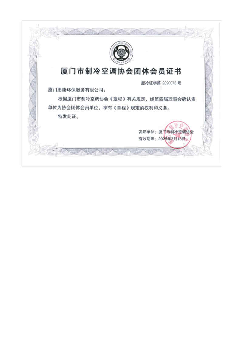 廈門制冷空調(diào)協(xié)會(huì)團(tuán)體會(huì)員證書