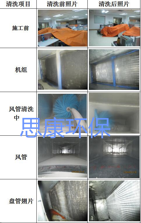 拆除各種風(fēng)口 →專業(yè)單位測定風(fēng)管內(nèi)積塵情況→放入專用檢查頭→觀察風(fēng)管內(nèi)部情況,確定清洗方案(可制作光盤)→在需清洗的風(fēng)管二頭放 置二個氣囊并于其中一邊開一個圓形工藝孔(或利用原有出風(fēng)口),并把該孔與捕集器的吸入口用軟管聯(lián)接→再從另一口內(nèi)(或利用原有出風(fēng)口)放入風(fēng)刀或振動鞭邊打松塵邊由捕集器同時把灰塵吸走→噴灑消毒劑→放入專用檢查頭觀察風(fēng)管清洗后情況(可制作光盤)→專業(yè)單位測定風(fēng)管清洗后情況 →安裝各種風(fēng)口→出具清洗完工報告。