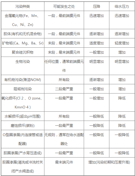 定時監(jiān)測系統(tǒng)整體性能是確認膜元件是否已發(fā)生污染的基本方法。污染對膜元件的影響是漸進的,并且影響的程度取決于污染的性質(zhì)。表1“反滲透膜污染特征及處理方法”列出了常見的污染現(xiàn)象和相應處理方法。