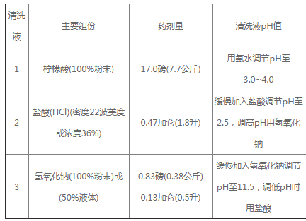 表2-常規(guī)清洗液配方提供的清洗溶液是將一定重量(或體積)的化學藥品加入到100加侖(379升)的潔凈水中(RO產(chǎn)品水或不含游離氯的水)。溶液是按所用化學藥品和水量的比例配制的。溶劑是RO產(chǎn)品水或去離子水,無游離氯和硬度。清洗液進入膜元件之前,要求徹底混和均勻,并按照目標值調(diào)pH值且按目標溫度值穩(wěn)定溫度。常規(guī)的清洗方法基于化學清洗溶液循環(huán)清洗一小時和一種任選的化學藥劑浸泡一小時的操作而設定的。